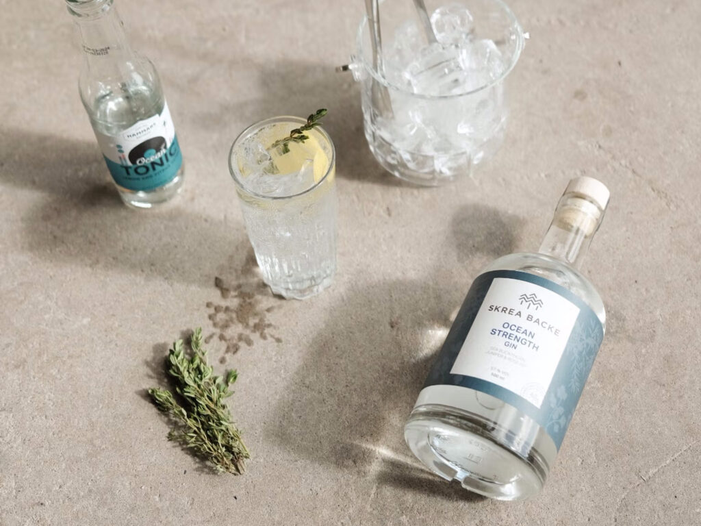 Förpackningsdesign för Skrea Backe Destilleris prisbelönta Ocean Strength.